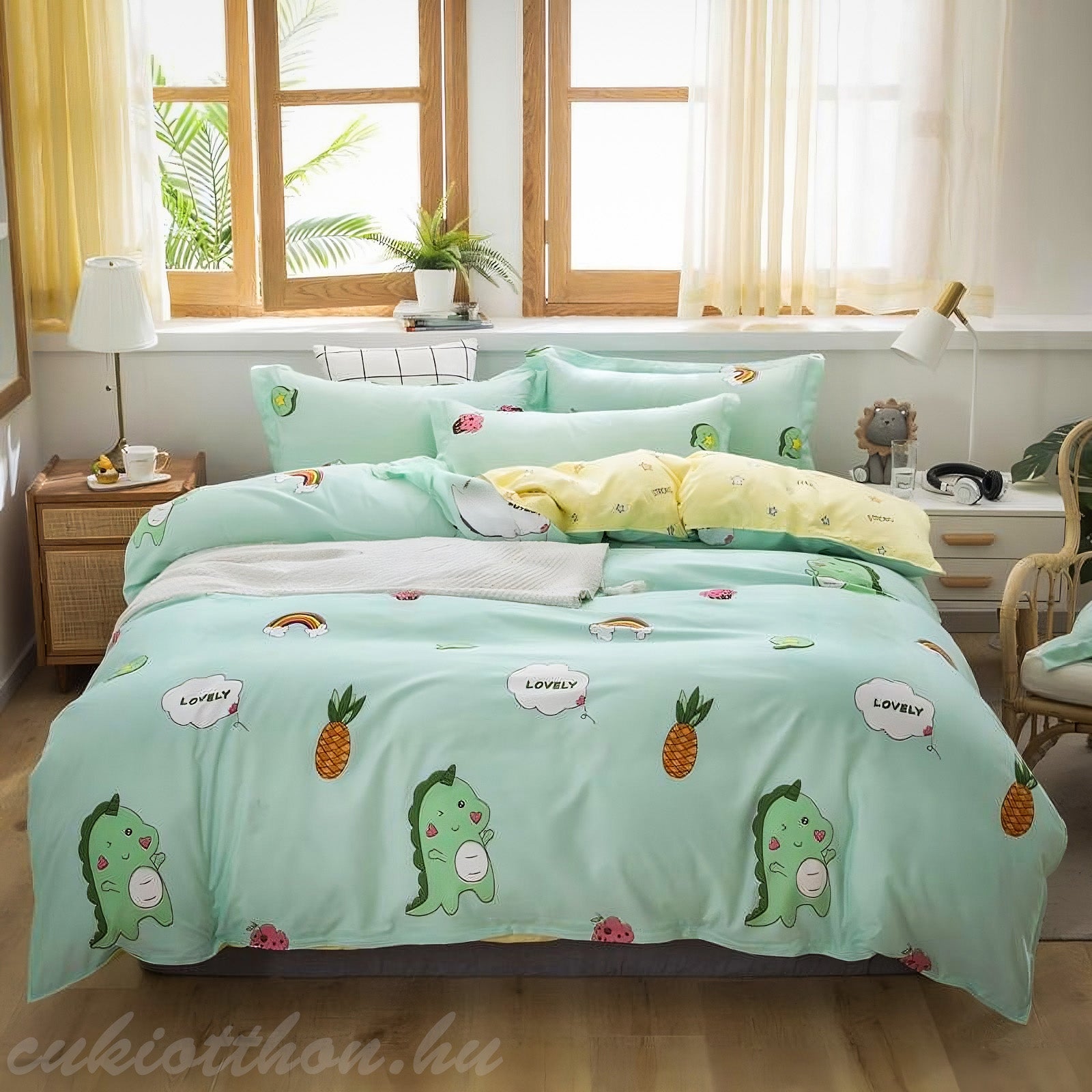 Sada povlečení "Dinó Koutek" vnáší do tvé ložnice veselou a hravou atmosféru! Na svěží mátově zeleném podkladu jsou roztomilé zelené dinosauří postavičky, živé žluté ananasy a roztomilé bubliny s nápisem "Lovely". Harmonie milých dinosaura a drobných detailů vytváří přátelskou a příjemnou atmosféru. Světle žlutý odstín na vnitřní straně přináší teplo do chvil odpočinku. Perfektní volba pro každého, kdo má rád veselé a hravé vzory. 🦖🍍✨